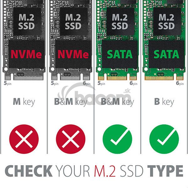 Do externého boxu je možné použiť SATA M.2 SSD disky až do rozmeru 22x80 mm. Box nemá obmedzenia kapacity SSD diskov. Karty M.2 môžu byť jednostranné alebo obojstranné. Bezšroubkové uchytenie vloženého M.2 SSD disku pomocou západiek zaisťuje veľmi jednoduchú montáž aj demontáž, hliníkové telo umožňuje dobré chladenie.