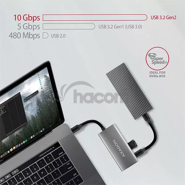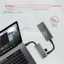 Vďaka pokročilému rozhranie USB 3.2 Generácia 2 môžete ku všetkým výstupom pripojiť vysokorýchlostné zariadenia ako NVMe M.2 externé disky až 2x vyššou rýchlosťou 10 Gb / s oproti štandardným hubu Generácia 1 s rýchlosťou iba 5 Gb / s. Hub zvládne trvalé pripojenie niekoľkých externých diskov súčasne a USB-C porty dovolí nabíjanie telefónov a tabletov prúdom až 3A.