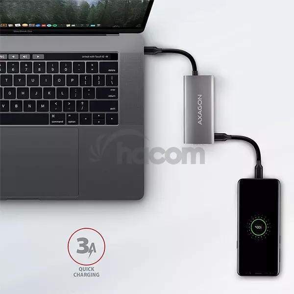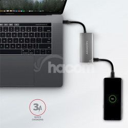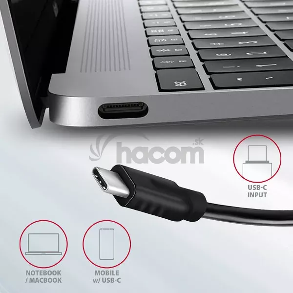 • Výkonné nabíjanie mobilných zariadení prúdom až 3A pri 5V v USB-C portoch hubu.