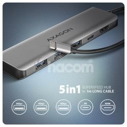 Multiportový USB-C 5Gbps AXAGON HMC-5H hub 5in1 rozšíri Váš notebook, počítač alebo telefón o päť portov . Cez obojstranný USB-C konektor ľahko a rýchlo pripojíte k počítaču monitor a tri USB zariadenia súčasne. Zároveň získate možnosť napájania notebooku pomocou technológie Power Delivery . Vďaka káblu s dĺžkou 1 m môžete zariadenia, ktoré potrebujete na prácu, pohodlne rozmiestniť podľa svojich potrieb. Replikátor portov tak zastane funkciu univerzálnej dokovacej stanice 5v1 pre moderné notebooky .USB rozbočovač ponúka tri USB výstupy s rýchlosťou 5Gbps so štandardným USB-A konektorom. Hub tiež zvládne trvalé pripojenie viacerých externých diskov súčasne. Vďaka rýchlemu USB 3.2 Gen 1 rozhraniu je prenosová rýchlosť hubu až 5Gb/s. Hub taktiež dokáže nabíjať mobilné telefóny a tablety pripojené do USB portov hubu prúdom až 1.5A/5V. Z hubu tak ľahko nabijete napr. Android smartfón, Apple iPhone, Apple iPad a pod.