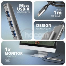 - AXAGON HMC-5H, USB 5Gbps húb, 3x USB-A, HDMI 4k/30Hz, PD 100W, kábel USB-C 100cm HMC-5H
