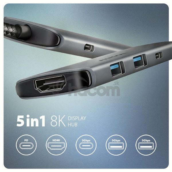 Multiportový USB-C 5Gbps húb AXAGON HMC-5H8K rozšíri Váš notebook, počítač alebo telefón o päť portov . Cez obojstranný USB-C konektor ľahko a rýchlo pripojíte k počítaču monitor a tri USB zariadenia súčasne. Zároveň získate možnosť napájania notebooku pomocou technológie Power Delivery . USB-C hub vám tak poskytne jednoduchú a skladnú dokovaciu stanicu 5v1 k moderným notebookom .USB rozbočovač ponúka tri USB 5Gbps výstupy . Dva so štandardným USB-A a ďalšie s USB-C dátovým konektorom. Hub zvládne trvalé pripojenie niekoľkých externých diskov súčasne. Vďaka rýchlemu USB 3.2 Gen 1 rozhraniu je prenosová rýchlosť hubu až 5Gb/s. Hub ďalej umožní nabíjanie telefónov a tabletov prúdom až 1.5A/5V, z hubu tak ľahko nabijete napr. Android smartfón, Apple iPhone, Apple iPad a pod.