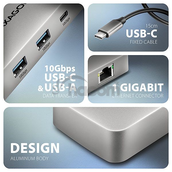 - AXAGON HMC-CUB83X2, USB 10Gbps húb, 2x USB-A, USB-C, HDMI a DP 4k/144Hz, RJ-45, PD 100W, kábel 15cm HMC-CUB83X2