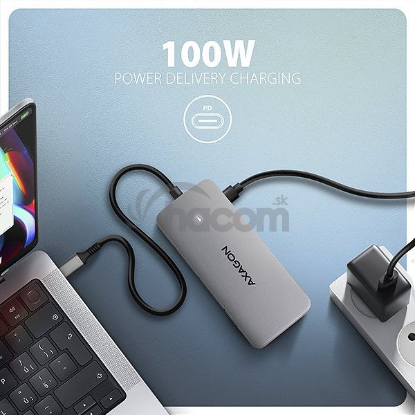 Ďalší USB-C konektor je vyhrazený iba na nabíjanie telefónov alebo notebookov pomocou technológie Power Delivery 3.0 výkonom až 100 W. Do hubu zapojíte vhodnú USB-C Power Delivery nabíjačku a húb pripojíte k notebooku s podporou Power Delivery. Tím tiež uvolníte jeden USB-C port.