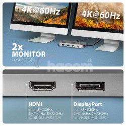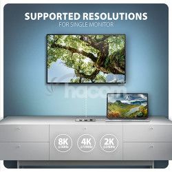 Dokovacia stanica ponúka dva video výstupy - HDMI a DisplayPort umožňujú pripojenie externých monitorov, televízorov alebo projektorov s rozlišením až 8K/30Hz Ultra HD. Podporované sú aj ďalšie rozlíšenia, napríklad 4K/144Hz Ultra HD, 2K/240Hz Quad HD alebo 1080p/240Hz Full HD a prenos viackanálového zvuku cez HDMI. Pri súčasnom zapojení dvoch monitorov poskytuje rozlíšenie 4K/60Hz na každom z nich. Vďaka podpore HDR (High Dynamic Range) si užívatelia môžu vychutnať výrazne širší rozsah farieb a vyšší kontrast, čo ocenia pri práci aj zábave.