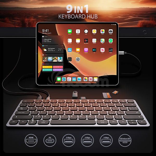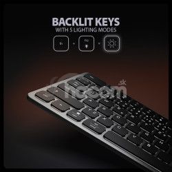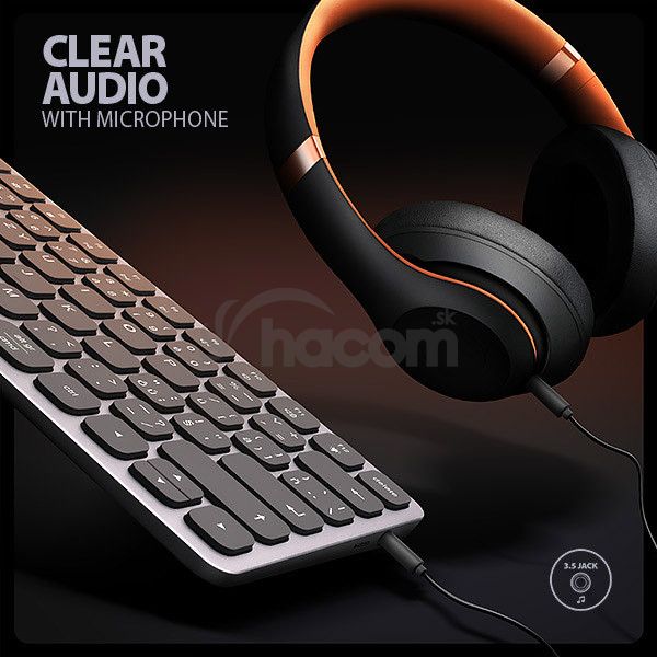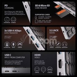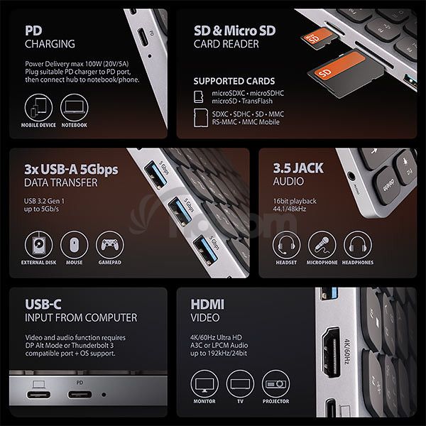 AXAGON HMC-KB-CS KEYBOARD húb premení Váš telefón, tablet alebo mini notebook na plnohodnotné počítačové pracovisko . Vaše mobilné zariadenie pripojíte k dokovacej stanici 9in1 cez dodaný 60 cm dlhý kábel . V okamihu tak máte k dispozícii integrovanú klávesnicu, čítačku SD aj microSD kariet a konektory pre pripojenie externého monitora, troch USB zariadení, slúchadiel alebo headsetu a Power Delivery napájania . Je však nutné, aby USB-C port vášho mobilného zariadenia podporoval video výstup (DisplayPort Alternate Mode) a Power Delivery napájania.Klávesnica, vstavaná v elegantnom hliníkovom tele hubu, je osadená chiclet klávesmi s nožnicovým mechanizmom a 2 mm zdvihom pre presné a tiché písanie. Klávesnica ponúka nastaviteľné podsvietenie v 5 úrovniach, 12 multimediálnych klávesov a možnosť zväčšenia sklonu pre pohodlné a ergonomické používanie . Samozrejmosťou je potlač kláves s česko-slovenskou lokalizáciou .
