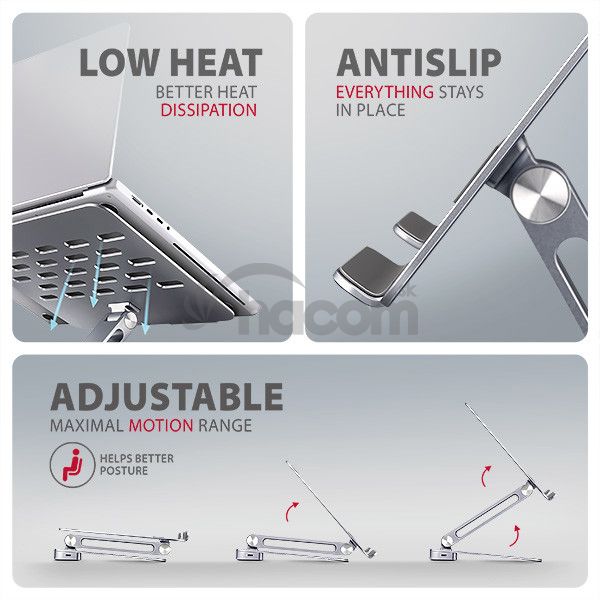Vďaka protišmykovej úprave zostane vaše zariadenie bezpečne na svojom mieste bez rizika nechcených pohybov, a to bez akéhokoľvek poškodenia povrchu notebooku alebo podložky.