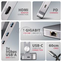 AXAGON HMC-STND 7in1 Hub & Stand je jedinečný multifunkčný húb integrovaný do stojana pre notebook alebo tablet. Tento húb rozšíri Váš notebook alebo tablet o ďalších šesť portov . Váš notebook pripojíte k hubu cez USB-C <-> USB-C kábel dlhý 60 cm. Okamžite tak máte k dispozícii pripojenie pre monitor , tri USB zariadenia , konektor RJ-45 pre Gigabitovú ethernet sieť a napájanie notebooku pomocou technológie Power Delivery . Stojan s dvoma kĺbmi zlepšuje ergonómiu a pohodlie pri práci a je vhodný pre zariadenia od 10" do 16" . Je ideálna ako dokovacia stanica 7v1 pre Windows notebooky aj Apple MacBook Air alebo MacBook Pro .Tri USB-A 5Gbps výstupy umožňujú pripojenie externých diskov (až 2 súčasne), flash disku, myši, tlačiarne a ďalšieho USB príslušenstva. USB porty taktiež nabíja mobilné telefóny a tablety výkonom až 7.5W. Gigabitová sieťová karta rozšíri počítač o rýchle a stabilné sieťové pripojenie, doplní chýbajúci sieťový RJ-45 Ethernet konektor, alebo pridá ďalšiu sieťovú kartu.