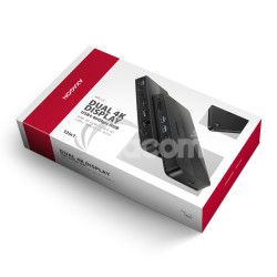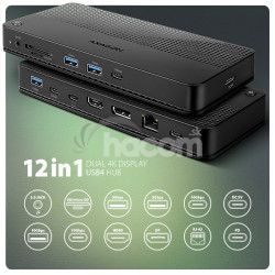 AXAGON HMC-U4 DUAL 4K DISPLAY dock premení Váš notebook, tablet alebo telefón na multimediálne centrum. Vďaka najmodernejšej technológii USB4 ponúka táto dokovacia stanica celkovú dátovú priepustnosť až 40 Gbps . Môžete tak naplno využiť aj to najnáročnejšie počítačové príslušenstvo a užiť si špičkový zážitok. Či už sledujete video v 8K rozlíšení, alebo pracujete s dvoma 4K monitormi súčasne , táto technológia vám zaistí potrebný výkon. USB4 ponúka výhodu kompatibility s technológiou Thunderbolt a zároveň podporuje spätnú kompatibilitu s predchádzajúcimi generáciami USB.Notebook pripojíte k dokovacej stanici 12in1 cez dodaný 80 cm dlhý kábel. V okamihu tak máte k dispozícii rýchlu čítačku SD aj microSD kariet a konektory pre pripojenie dvoch externých monitorov, päticu USB zariadenia, slúchadiel alebo headsetu a Power Delivery napájania . Je však nutné, aby USB-C port vášho zariadenia podporoval video výstup (DisplayPort Alternate Mode) a Power Delivery napájania.