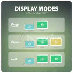 • Na dosiahnutie maximálnych hodnôt rozlíšenia a frekvencií na video výstupoch je nutné dock zapojiť do USB-C portu s podporou DisplayPort Alternate Mode (DP Alt Mode) verzie min. 1.4 alebo do USB-C portu s podporou min. Thunderbolt 4. Ďalej je nutný vhodný aktualizovaný OS a aktuálne grafické ovládače.