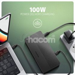 USB-C vstup (PD) je určený pre Power Delivery nabíjačku. Vďaka tomu je ako notebook, tak aj dock, napájaný priamo z PD nabíjačky s využitím technológie Power Delivery 3.0 s výkonom až do 100W . S prídavným napájaním cez USB-C vstup (DC 5V) môžete posilniť napájanie, pri prevádzke bez pripojenej PD nabíjačky ak multiportovému hubu pripojiť aj zariadenia s vyššou spotrebou energie napríklad viacerých externých diskov.