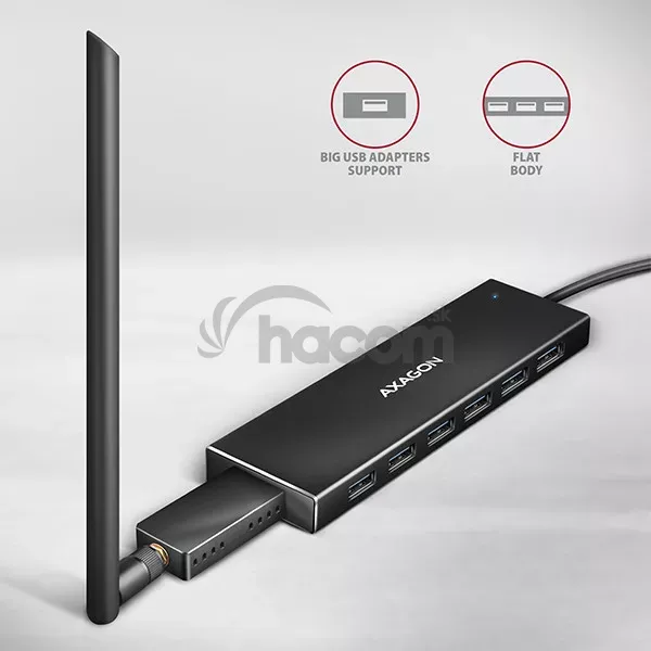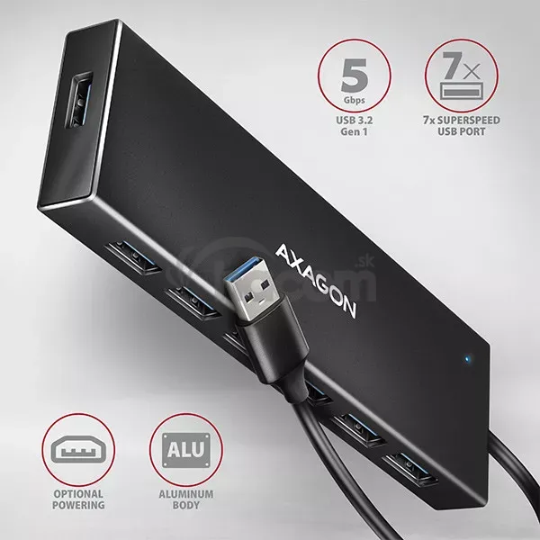 - AXAGON HUE-F7A, 7x USB 3.2 Gen 1 ALU FLAT CHARGING húb, micro USB napájací konektor, kábel USB-A 1m HUE-F7A