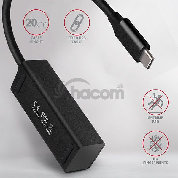 Miniatúrne kovový USB-C 3.2 Gen 1 húb AXAGON HUE-M1C ľahko a rýchlo pripojí k notebooku alebo počítaču až štyri USB zariadení súčasne. Kovové telo hubu je vyrobené z hliníka a zaisťuje tak dokonalú mechanickú ochranu pre časté prenášanie. Elegantný, jemne štruktúrovaný povrch bráni nežiadúcim odtlačkom. Gumové nožičky zabraňujú kĺzaniu hubu po stole. Napevno uchytený USB kábel dĺžky 20 cm je ideálny pre užívateľov mobilných zariadení.Tento malý cestovný húb tiež zvládne trvalé pripojenie niekoľkých externých diskov. Vďaka rýchlemu USB 3.2 Gen 1 rozhranie je prenosová rýchlosť až 5Gb / s. Hub ďalej umožní nabíjanie telefónov a tabletov prúdom až 1,5A / 5V, z hubu tak ľahko nabijete napr. Android smartphone, Apple iPhone, Apple iPad a pod.