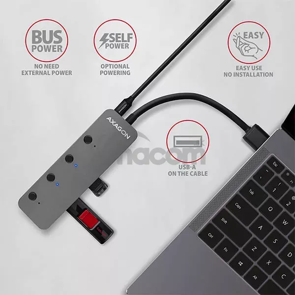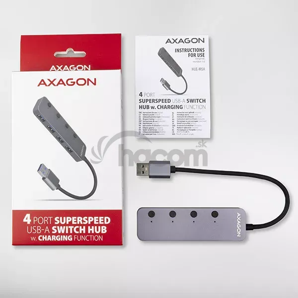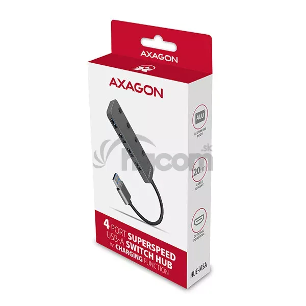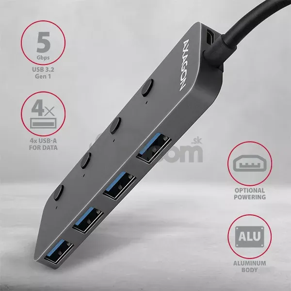 - AXAGON HUE-MSA, 4x USB 3.2 Gen 1 SWITCH húb, kovový, micro USB nap. konektor, kábel USB-A 20cm HUE-MSA
