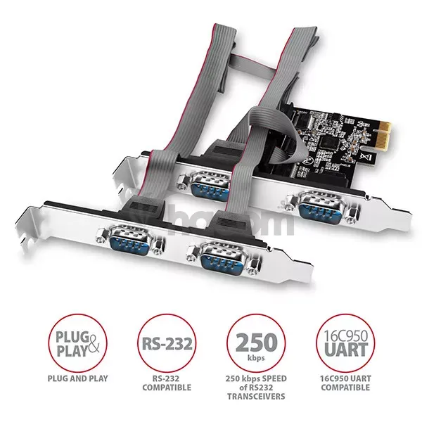 PCI-Express karta AXAGON PCEA-S4N rozšíri stolný počítač o štyri sériové RS-232 porty s DB-9 konektory.Vysoký výkon, bezproblémová kompatibilita a široké možnosti nastavenia portov sú zaistené použitím osvedčeného čipsete spoločnosti ASIX.