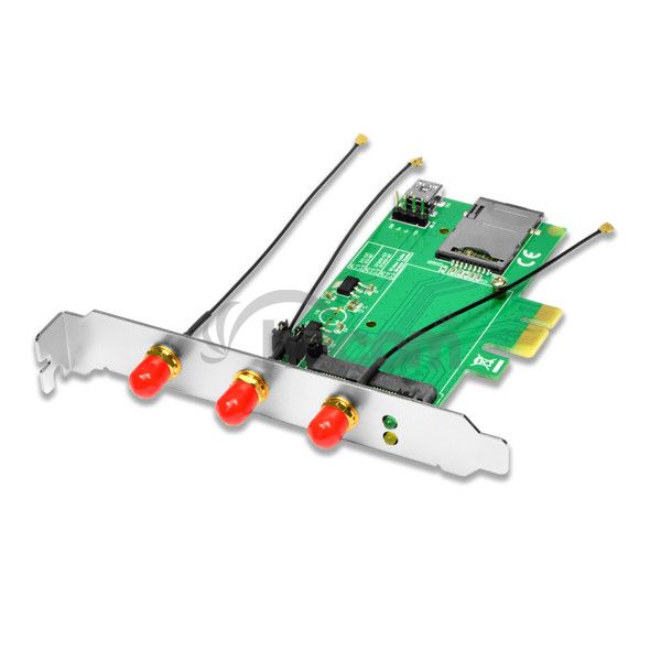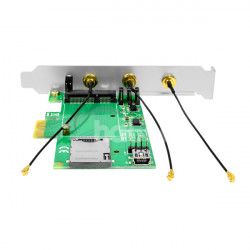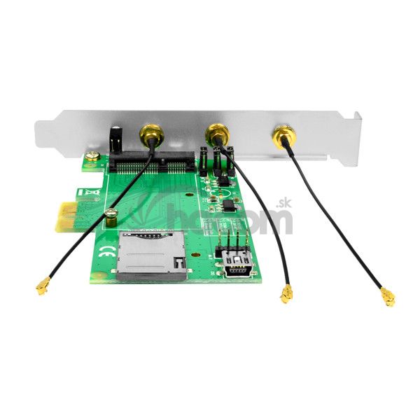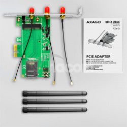 Interný adaptér AXAGON PCEM-E3 umožňuje pripojenie mini PCI-Express kariet do počítača. Pomocou tejto redukcie zapojíte nevyužitú mini PCI-e wifi kartu, modem alebo bluetooth modul z notebooku do počítača. Možno tak ľahko pripojiť stolný počítač k wifi sietí a v kombinácii s 3G / 4G / LTE modemom tiež k mobilnej dátovej sieti.Vďaka rozhranie PCI-Express 2.0 1-lane dosiahnete prenosových rýchlostí až 5 Gbps. Tri štandardné SMA konektory s dodávanými anténami umožňujú tiež použitie s MIMO kartami. VF káble pre pripojenie wifi / bluetooth / 3G / 4G / LTE modulu sú napevno pripevnené k SMA konektorom. Súčasťou adaptéra je slot pre SIM kartu štandardnej veľkosti. Dve LED diódy vyvedené na záslepku indikujú, že je karta zapojená a napájaná a druhá indikuje prenos dát.