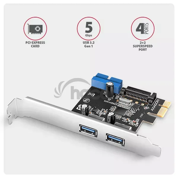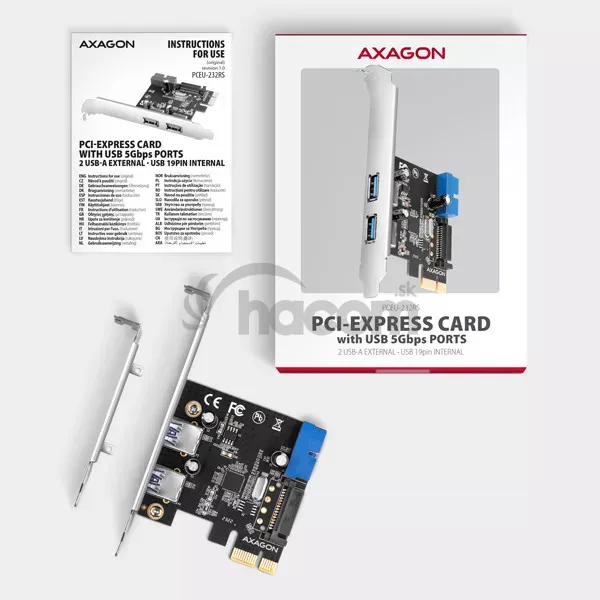 PCI-Express karta AXAGON PCEU-232RS rozšíri stolný počítač o štyri USB 5Gbps porty . Karta je navrhnutá pre rýchle dátové prenosy rýchlosťou až 5 Gb/s.Dva USB-A porty sú vyvedené na záslepku. Môžete tak pripojiť dve rôzne USB zariadenia napríklad tlačiarne, klávesnice, čítačky kariet, flashdisky, externé HDD atď. Ďalšie dva porty (vo forme interného USB 5Gbps 19pin konektora) sú integrované na doske karty. Umožňujú tak pripojenie internej USB čítačky alebo zapojenie predných USB portov PC skrine.