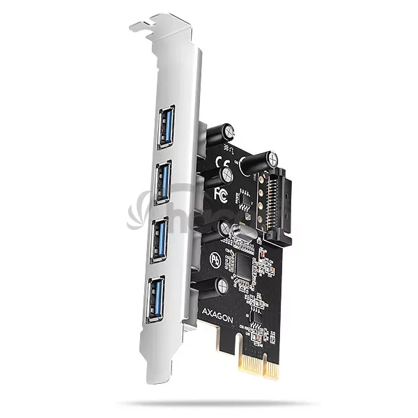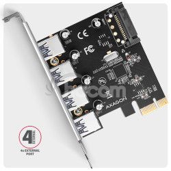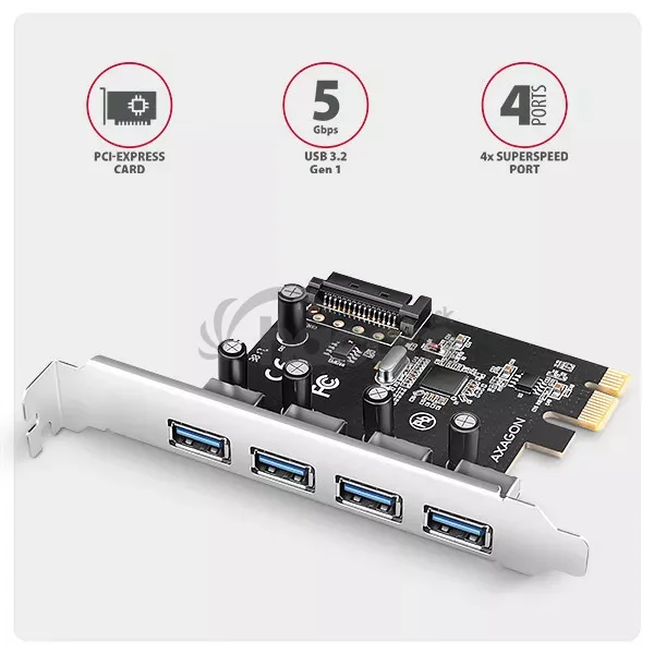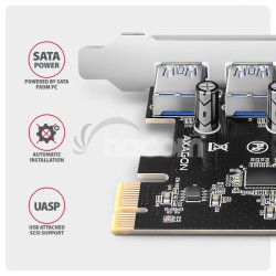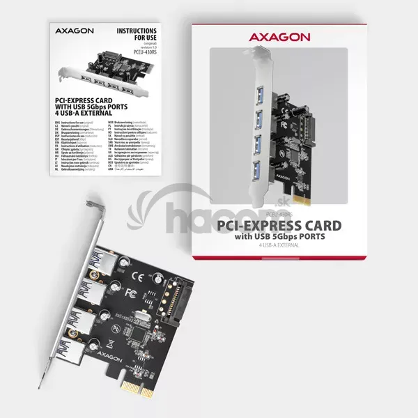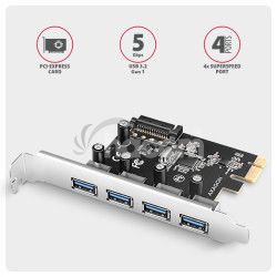 - AXAGON PCEU-430RS, PCIe radič, 4x USB 5Gbps port, SATA napájanie, Renesas PD720201, SP PCEU-430RS