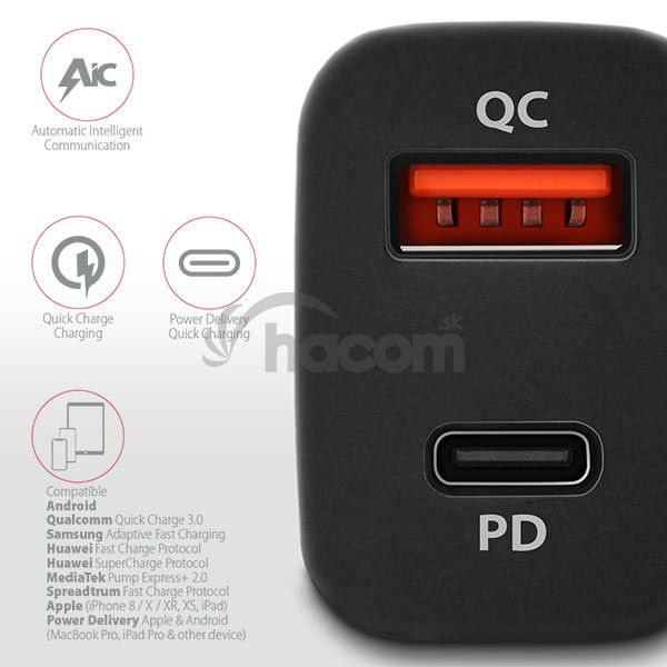 • PD - rýchlonabíjanie zariadenie s podporou USB Power delivery a nabíjanie Apple MacBook, MacBook Pro, iPad Pro.