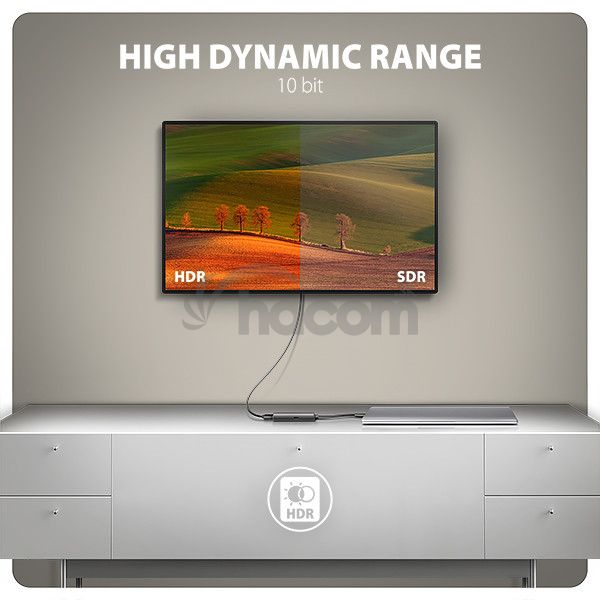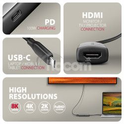 USB-C -> HDMI aktívny adaptér - redukcia AXAGON RVC-HI8KPD pre pripojenie HDMI monitora/TV/projektora k notebooku, tabletu alebo telefónu s výstupom USB-C. Táto redukcia vám umožní ľahko využiť váš existujúci HDMI kábel na pripojenie zariadení ako Apple MacBook Air alebo Pro .Tento kompaktný hardvérový prevodník nevyžaduje žiadnu inštaláciu a zaisťuje vynikajúci obraz až do rozlíšenia 8K/60 Hz Ultra HD. Podpora 8K rozlíšenia vám umožní sledovať videá v úchvatnej kvalite, zatiaľ čo vysoké frekvencie HDMI zaručujú špičkový zážitok pri sledovaní filmov, videí alebo hraní hier. K dispozícii sú tiež populárne rozlíšenia ako 4K/144 Hz Ultra HD, 2K/240 Hz Quad HD alebo 1080p/240 Hz Full HD. Vďaka podpore HDR (vysoko dynamický rozsah) si môžete užiť širokú škálu farieb a kontrastov bez akýchkoľvek kompromisov.