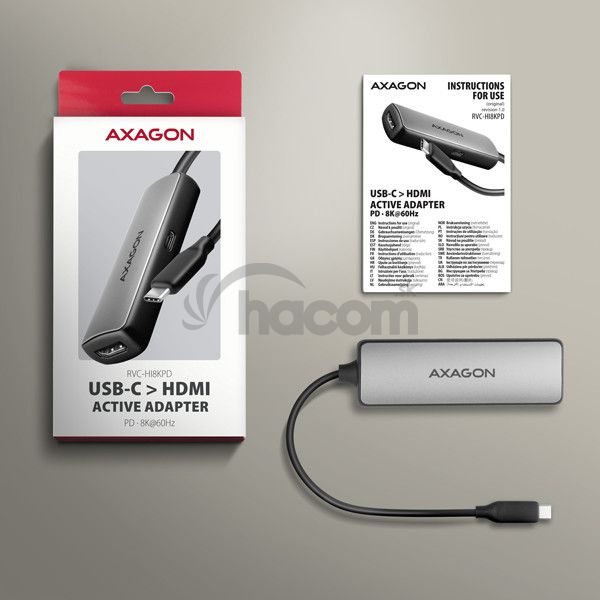 - AXAGON RVC-HI8KPD, USB-C -> HDMI 2.1 redukcia/adapter, 8K/60Hz, 4K/144Hz, HDR10+, PD100W RVC-HI8KPD