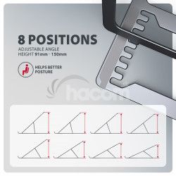 Veľkou výhodou je možnosť nastavenia až ôsmich poloh. Vďaka tomu môžete notebook zdvihnúť do výšky od 91 do 150 mm . Tím získate ďalšiu pracovnú plochu v správnej úrovni očí, čo výrazne zlepšuje ergonomiu a pohodlie pri práci, a zároveň zvyšuje vašu produktivitu.