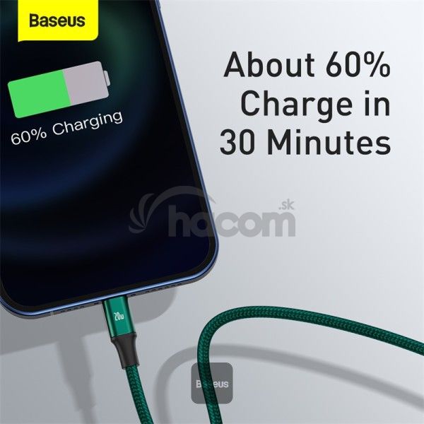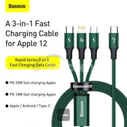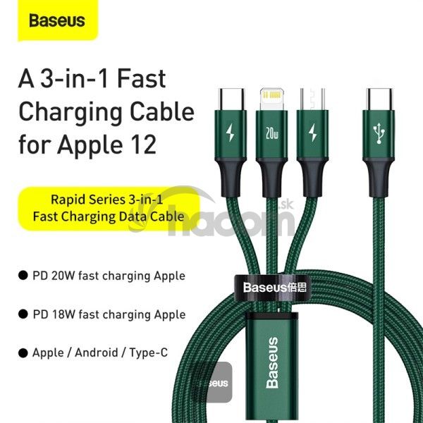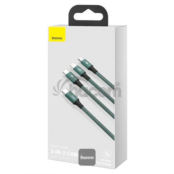 - Baseus dátový kábel Rapid 3v1 USB-C/microUSB, Lightning, USB-C 1,5m PD 20W zelený 6953156204300