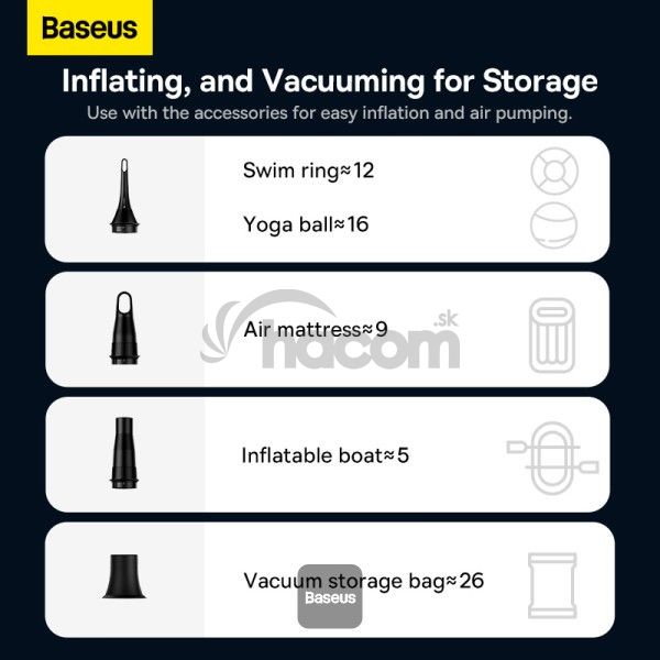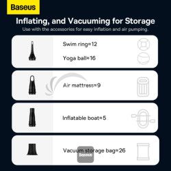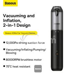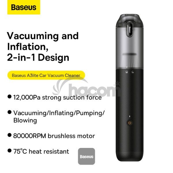 Autovysávač Baseus A3 Lite s mini dúchadlom, hustilkou a pumpovaním / 3 v 1, prenosné bezdrôtové, 12 000 Pa, dobíjacia - čierna*Vyskúšajte, aké jednoduché môže byť čistenie auta. Aku vysávač do auta Baseus A3 Lite vyniká sacím výkonom, ktorý dosahuje až 12 000 Pa a rýchlosťou motora 80 000 ot./min. Odolná batéria poskytuje až 30 minút prevádzky a HEPA filter účinne odstraňuje aj tie najjemnejšie prachové častice. V sade nájdete až 4 prídavné nástavce, s pomocou ktorých nafúknete matrac, koliesko na plávanie alebo môžete povysávať vzduch z vákuového vrecka na oblečenie.