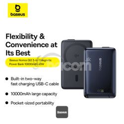 Powerbanka Baseus Nomos 3 v 1 10 000 mAh - 15W bezdrôtová nabíjačka s certifikáciou Qi2, vstavaný dvojcestný kábel pre rýchle nabíjanie 45 W, port typu C, stojan - čiernaZažite bezkonkurenčné pohodlie nabíjania s Power Bank Baseus Nomos Qi2, prenosnou nabíjačkou 3 v 1 navrhnutou pre váš rýchly životný štýl. Vďaka kapacite 10 000 mAh, 15W bezdrôtovému nabíjaniu s certifikáciou Qi2 a 45W rýchlemu nabíjaniu USB-C táto powerbanka zaistí, že vaše zariadenia budú vždy pripravené, či už doma, v kancelárii alebo na cestách.