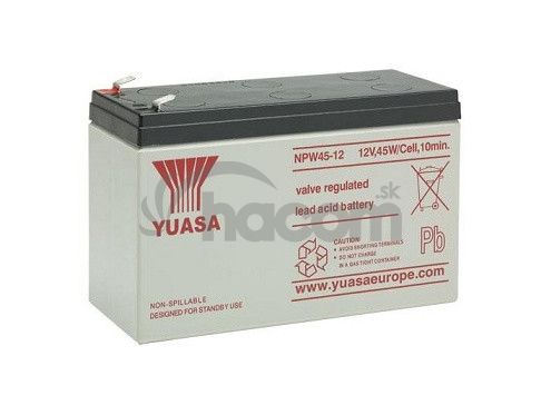 YUASA NPW45-12 je hermeticky uzavretý Vysokoprúdový olovený akumulátor (zodpovedajúce 9Ah) určený pre záložné zdroje a iné elektornickej systémy. Vyniká vysokou kvalitou spracovaním, možno ich prevádzkovať v ľubovoľnej polohe a nevyžaduje žiadnu údržbu.Japonská firma Yuasa je najväčší svetový výrobca olovených akumulátorov. V roku 2020 kúpila výrobnú továreň Panasonic, ktorý tak ukončil výrobu olovených akumulátorov a Yuasa sa stala lídrom v tomto odbore.