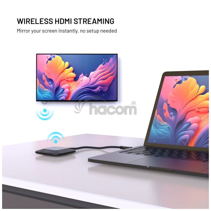 Popis produktu:Bezdrôtový HDMI adaptér FIXED AirLink umožní ľahké streamovanie obrazu z notebooku na televíziu, monitor či projektor bez nutnosti ďalších káblov alebo inštalácie aplikácií a ovládačov. Stačí zapojiť kompaktný vysílač do USB-C portu notebooku či iného zariadenia s funkciou prenosu dát, prijímač pripojiť do HDMI a USB portu zobrazovacieho zariadenia a jedným stlačením tlačidla obe časti spárovať. Počas okamihu dojde k prepojeniu a už môžete využívať plynulé zrkadlenie obrazu. Adaptér podporuje rozlišení Full HD 1080p pri 60 Hz a ponúka režim zrkadlenia aj rozšírenej plochy, čo oceníte ako pri práci, tak zábave. Vďaka minimálnej latencii rádovo maximálne 10 milisekund je obraz prenášaný prakticky v reálnom čase, bez viditeľného zpoždenia pri sledovaní videí, filmov alebo prezentácií. FIXED AirLink zároveň umožňuje rýchle priechodné nabíjanie cez USB-C port s podporou Power Delivery s výkonom až 100W, takže môžete pohodlne sdielať a zároveň notebook napájať. Adaptér je kompatibilný s Windows, macOS, iOS aj Android zariadeniami, ktoré majú USB-C alebo Thunderbolt 3/4 port s podporou DisplayPort Alt Mode. Dosah prenosu je 30 metrov a odolný 20 cm opletený kábel zaisťuje dlhú životnosť. S FIXED AirLink prenášajte obraz úplne bezstarostne a kdekoľvek.