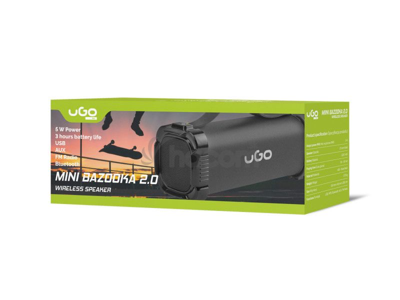 UGO MINI BAZOOKA je zariadenie, ktoré môžete vziať kamkoľvek. Reproduktor je bezdrôtový a vďaka odnímateľnému pásu ho môžete zavesiť cez rameno a presunúť sa na obľúbené miesta. Bojíte sa výdrže reproduktora? Zbytočne! Vstavaná batéria s kapacitou 1500 mAh vám umožní počúvať hudbu až do 3 hodín.technické parametre