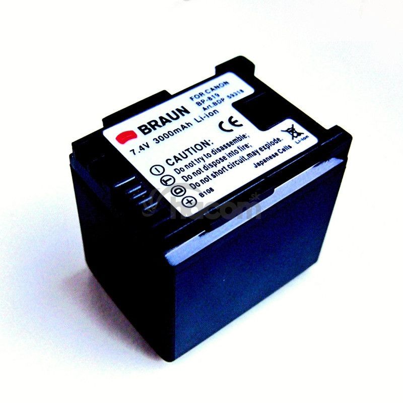 Li-Ion akumulátor Braun BDP-CBP819 EC (24, CANON BP-819 - 7,4 V/3000 mAh) pre digitálne videokamery CANON FS10, FS11, FS20, FS21, FS22, FS36, FS37, FS46, FS5 , FS306, FS307, FS406, FF10, FF11, FF20, FF21, FF100, FF200, FF G10, FF 25, FF 30, FF 40, FF 3, FF 3 M56, HFM 306, HFM 406, HF S10, HF S11, HF S20, HF S21, HF S100, HF S200, HG20, HG21, XA10, XA20, XA25, XA30, XA35, XA5. Tento akumulátor je dodávaný v čiastočne nabitom stave.Pred použitím je vhodné akumulátor nabiť. Plná kapacita akumulátora môže byť dosiahnutá až po cca 4-5 nabíjacích cykloch. V prípade viacerých modelov jedného typu akumulátora s rôznou kapacitou vyberajte podľa odporúčania výrobcu prístroja !!! Vyššia kapacita umožňuje dlhšiu dobu záznamu, ale väčší rozmer (výška) akumulátora môže komplikovať alebo úplne brániť použitiu !!!