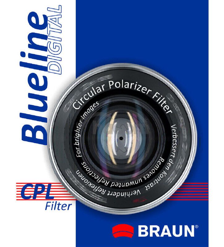 Cirkulárne polarizačné filtre Braun radu BlueLine. Čierny krúžok, špeciálne optické sklo a povrchová úprava pre digitálne fotoaparáty.Úlohou polarizačného filtra je odstraňovať polarizované svetlo, ktoré vzniká napr. odrazom od lesklých nekovových plôch alebo rozptylom slnečného svetla v atmosfére - výsledkom sú krásne sýte farby a efektné zvýraznenie mrakov nielen pri krajinárskej fotografii.