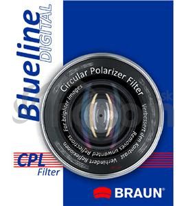 Cirkulárne polarizačné filtre Braun radu BlueLine. Čierny krúžok, špeciálne optické sklo a povrchová úprava pre digitálne fotoaparáty.Úlohou polarizačného filtra je odstraňovať polarizované svetlo, ktoré vzniká napr. odrazom od lesklých nekovových plôch alebo rozptylom slnečného svetla v atmosfére - výsledkom sú krásne sýte farby a efektné zvýraznenie mrakov nielen pri krajinárskej fotografii.