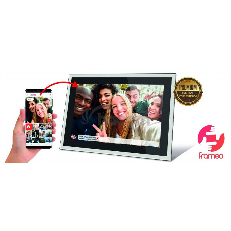 WiFi digitálny fotorámik s uhlopriečkou 10", rozlíšenie 1920x1200px, 16:10 IPS, prehrávanie JPEG/MP3/Video, 16GB interná paneť, aplikácia FRAMEO (Android/iOS, FREE) pre zasielanie obrázkov a videí z telefónu, G-senzor pre h/ v pozícii, micro SDHC slot, micro USB, čierny.Slim design, WLAN modul 802.11 b/g/n, opierka na stôl, jednoduchá obsluha a nastavenie pomocou bezplatnej aplikácie FRAMEO, ideálny pre aktualizáciu obsahu a nastavenia rámčeka z telefónu doma aj na cestách , možnosť horizontálnej aj vertikálnej prevádzky, vnútorná pamäť pre až 999 obrázkov, maximálna doba pre video 15s, , micro SD karty do 32GB Rozmery 400x250x25mm, hmotnosť 1250g, sieťový zdroj 5V/2A.