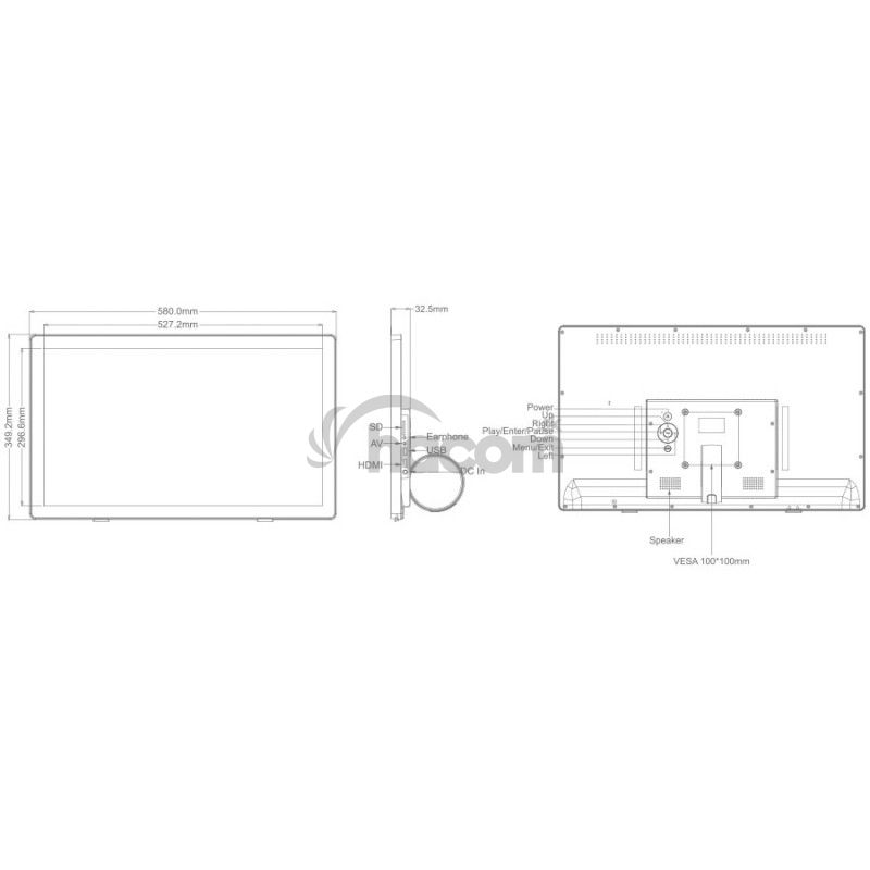 Profesionálny IPS digitálny fotorámik s uhlopriečkou 24", rozlíšenie 1920x1080p/ 16:9, prehrávanie JPEG/MP3/Video, HDMI/mini USB/USB/AV/SD slot, AV výstup, Stereo 2x3W reproduktory, IR diaľkový ovládač, rozmery 580,0x ,2x32,5 mm, hmotnosť 7,5 kg, čierny.Veľkosť displeja 527,2x296,6 mm, VESA 100x100mm na stenu, opierka na stôl, Auto ON/OFF, Auto Start/Play/Loop (Repeat), zabudovaný procesor s Easy2Use riadiacim softvérom bez nutnosti prepojenia s počítačom, jednoduchá obsluha a nastavenie, výkonný externý sieťový zdroj, možnosť horizontálnej i vertikálnej prevádzky, Kensington zámok proti krádeži.