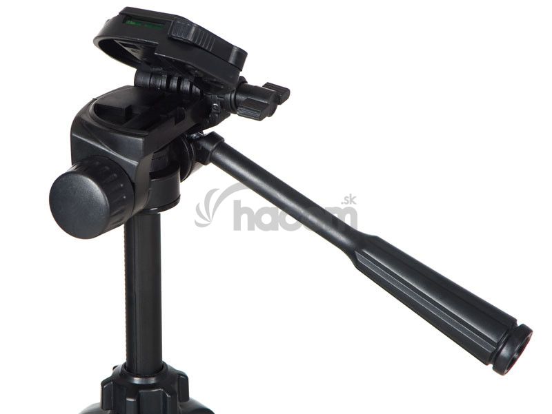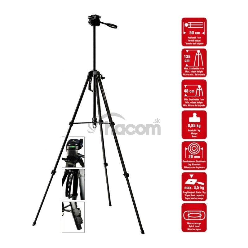 Ľahký hliníkový foto/video statív, 3-smerná hlava s výmennou doštičkou, vodováha, 3 segmenty nôh so svorkami, profil 20mm, zaťaženie maximálne 3,5kg, rozmery: zložený 50cm / výška 48-135cm, hmotnosť 850g, farba čierna, vrátane púzdra .Stredový stĺpik so vzperami pre vyššiu stabilitu, nastavenie výšky kľučkou, háčik na zavesenie príslušenstva alebo závažia, plastové ucho na transport, nohy zakončené gumou.
