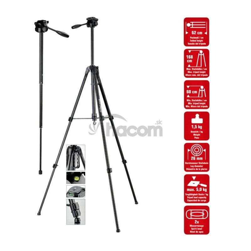 Ľahký hliníkový foto / video statív, 3-smerná hlava s výmennou doštičkou, 2x vodováha, 3 segmenty nôh so svorkami, profil 26mm, zaťaženie maximálne 5kg, rozmery: zložený 62cm / výška 60-168cm, hmotnosť 1500g, farba čierna, vrátane púzdra. Stredový stĺpik so vzperami pre vyššiu stabilitu, nastavenie výšky s aretáciou skrutkou a možnosť vybratia plnohodnotného monopodu s hlavou (5 sekcií s výškou 190cm, Click fixácia), háčik na zavesenie príslušenstva alebo závažia, plastové ucho pre transport, nohy zakončené gumou.
