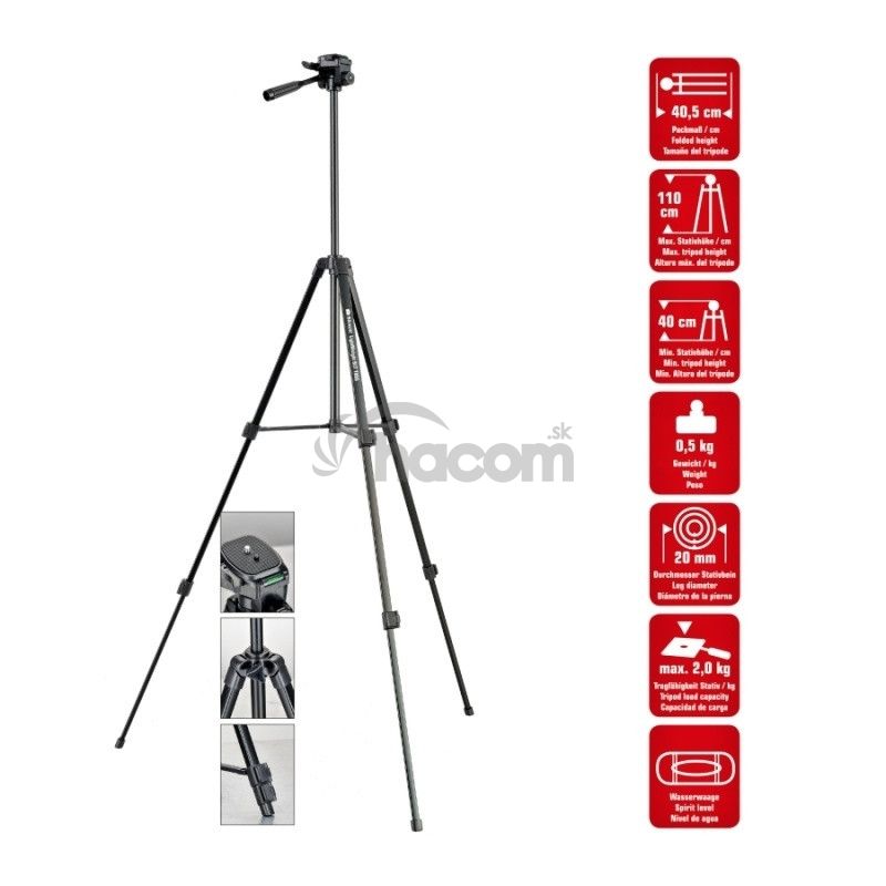 Ľahký hliníkový foto / video statív, 3-smerná hlava s výmennou doštičkou, vodováha, 3 segmenty nôh so svorkami, profil 20mm, zaťaženie maximálne 2kg, rozmery: zložený 40,5 cm / výška 40-110cm, hmotnosť 500g, farba čierna, vrátane púzdra . Stredový stĺpik so vzperami pre vyššiu stabilitu, nastavenie výšky s aretáciou skrutkou, nohy zakončené gumou.Parametre