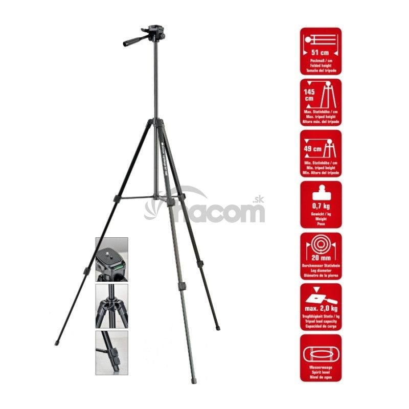 Ľahký hliníkový foto / video statív, 3-smerná hlava s výmennou doštičkou, vodováha, 3 segmenty nôh so svorkami, profil 20mm, zaťaženie maximálne 2kg, rozmery: zložený 51cm / výška 49-149cm, hmotnosť 700g, farba čierna, vrátane púzdra.Stredový stĺpik so vzperami pre vyššiu stabilitu, nastavenie výšky s aretáciou skrutkou, nohy zakončené gumou.