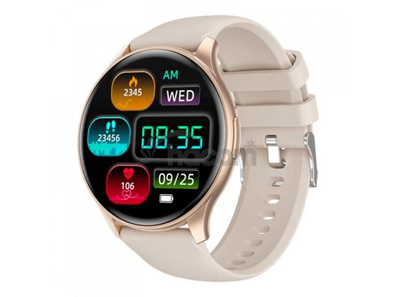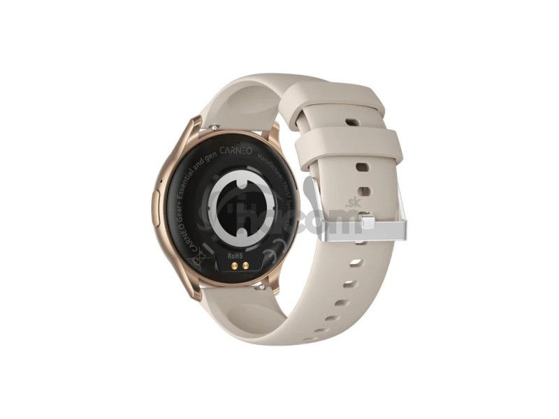 Chytré hodinky Carneo Gear+ Essential 2nd gen.Moderné, fitness hodinky CARNEO Gear Essential druhej generácie v zlatej farbe s béžovým na dotyk veľmi príjemným silikónovým remienkom a farebným SUPER AMOLED displejom s vysokým jasom a funkciou trvalého zobrazenia času. Monitorujú vašu dennú aktivitu, úroveň stresu a je možné ich spárovať s mobilným telefónom a upozorniť Vás na prichádzajúci hovor alebo SMS. Hodinky umožňujú telefonovať bez toho, aby ste vytiahli telefón z tašky so vstavaným mikrofónom a reproduktorom až do vzdialenosti 10 m od telefónu.