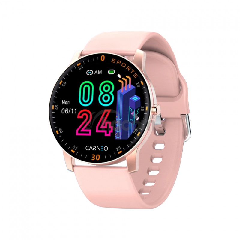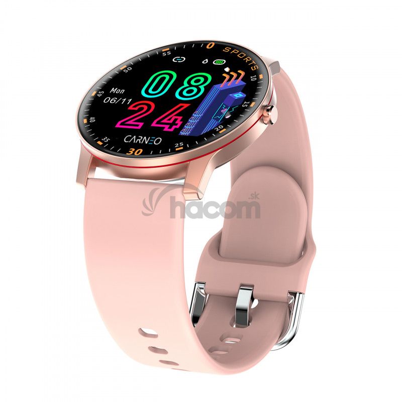 Moderné fitness náramok Carneo Gear + Platinum žena v elegantnom ružovom prevedení disponuje OLED farebným displejom, ktorý možno aktivovať jednoduchým otočením ruky. Umožňuje merania srdcového tepu, prejdenej vzdialenosti, monitorovanie spálených kalórií či kvality spánku. Jeho súčasťou je batéria s výdržou cca 7 dní. Podľa certifikácia IP67 je odolný voči vode a prachu. Náramok s podporou technológie Bluetooth je kompatibilný s operačným systémom iOS a Android. Silikónový náramok s kovovou prackou je príjemný na dotyk a zaručuje komfort počas celého dňa.
