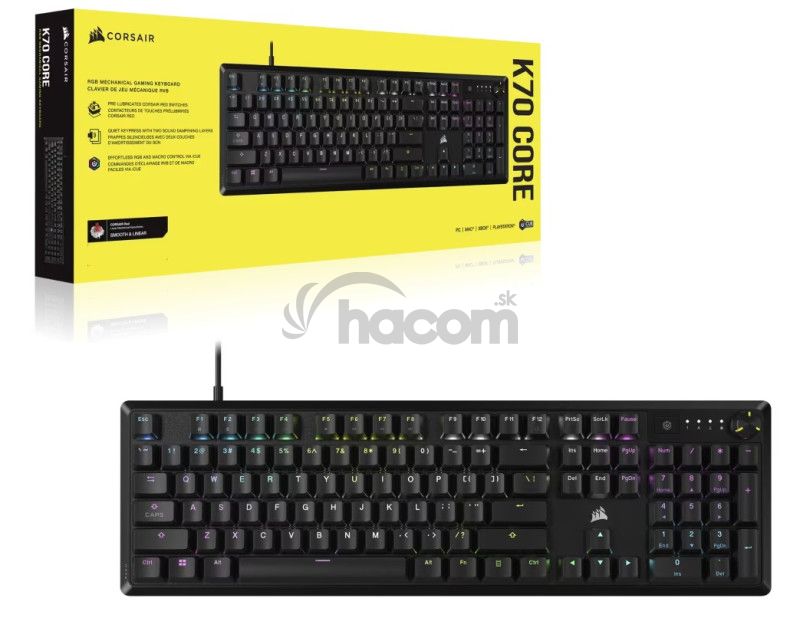 CORSAIR K70 CORE RGB Mechanická Herná Klávesnica - ČiernaHerná klávesnica CORSAIR K70 CORE vám umožní hrať čo najlepšie a vďaka ovládaniu médií bez námahy a lineárnym spínačom CORSAIR MLX Red je hranie a písanie úžasné.