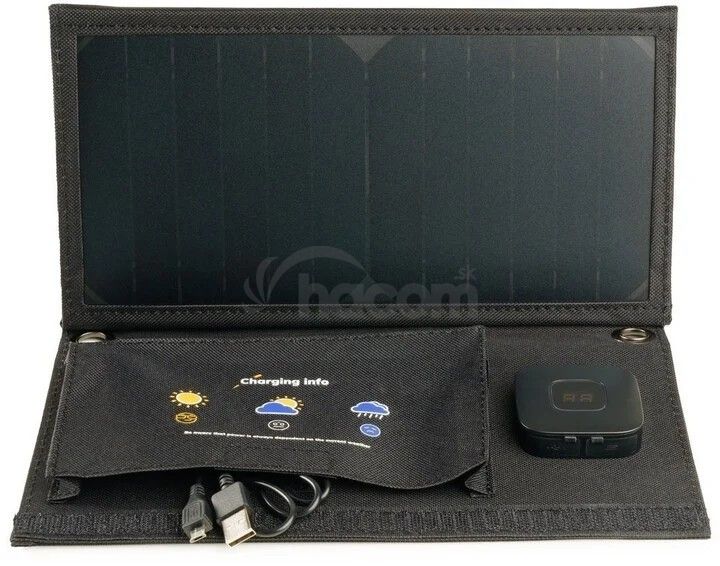 Solárna nabíjačka vám umožní vďaka svojej energetickej účinnosti 21 - 23% plne zastúpiť klasickú nabíjačku. Panel má 2 USB výstupy pre 2 mobily alebo mobil a powerbanku.*Tvoria ju 4 panely spojené veľmi odolnou tkaninou