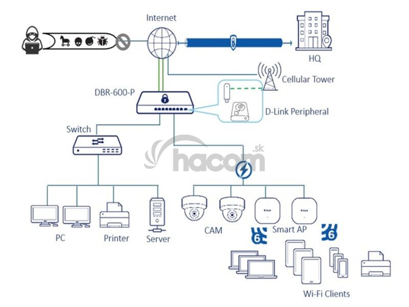 Je ideálny pre malé kancelárie a kaviarne, obsahuje USB port pre 4G/5G USB modem D-Link, ktorý ponúka flexibilné zálohovanie internetu. Vďaka 2Gb/s firewallu a IPsec VPN tunelom zaisťuje bezpečný vzdialený prístup. Integrovaná správa AP a PoE zjednodušuje ovládanie bezdrôtových prístupových bodov, čo z neho robí vynikajúcu volbu pre firmy hľadajúce efektívne a bezpečné sieťové riešenia.