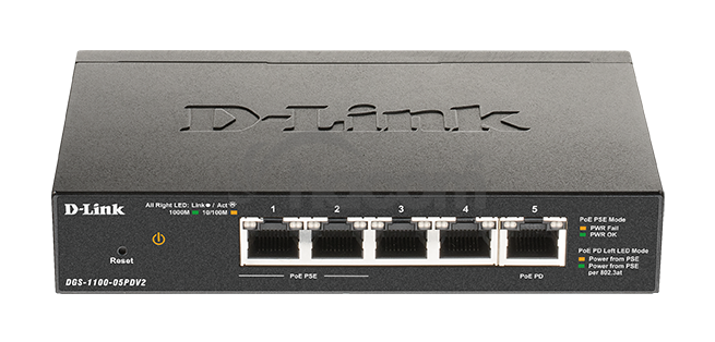 D-Link DGS-1100v2 je nová generácia Gigabit Smart riadených prepínačov určených pre malé a stredné podniky (SMB), pracovné skupiny (workgroup) a kancelárie (SOHO). Model DGS-1100-05PDv2 je kompaktný 5-portový 10/100 / 1000M switch napájaný cez PoE podľa štandardov 802.3af / 802.3at, nemožno napájať pomocou externého adaptéra či zo zdroja 230V. Switch podporuje funkciu PoE Pass Through pre napájanie až dvoch pripojených zariadení podľa PoE 802.3af, s celkovým PoE výkonom max. 18W pri napájaní switche z 802.3at PoE + alebo max. 8W pri napájaní switche z 802.3af PoE. Switch je osadený 5 metalickými portami 1000Base-T RJ-45, kde jeden port je PoE-PD (PoE Powered Device) a dva porty sú PoE-PSE (Power Sourcing Equipment).