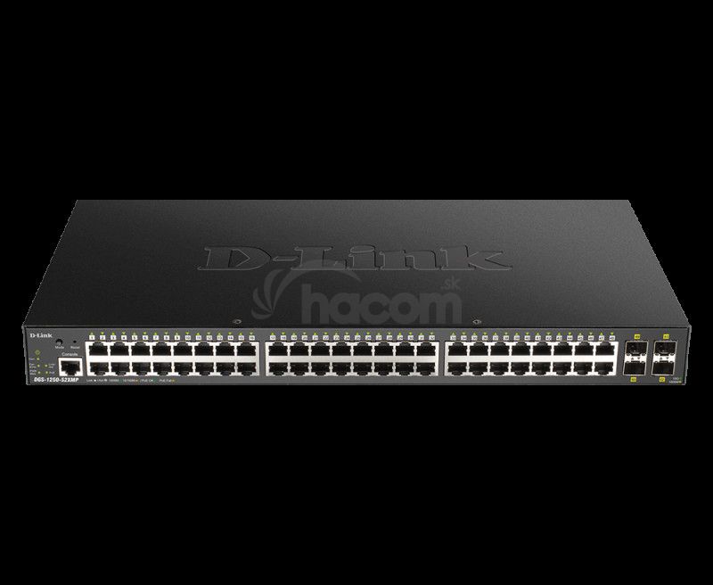 D-Link DGS-1250-52XMP je L2 / L3 Gigabit Smart Managed switch osadený 24 porty 10/100 / 1000Base-T RJ-45 s podporou napájania 802.3at PoE + (max. 30W na port) a 4 dvojrýchlostným 1G / 10G SFP + porty pre uplink alebo pre pripojenie serverov, s podporou Gigabit SFP a 10G SFP + transceiverov. Celkový PoE výkon switcha je 370W.