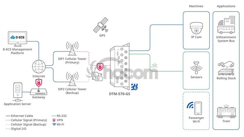* vylepšená palubná telematika a infotainment - DTM-570-GS posilňuje železničnú dopravu vďaka pokročilej konektivite, ktorá prepája palubné zariadenia RS-232 a Ethernet s internetom prostredníctvom robustnej siete 5G. Toto nastavenie nielen uľahčuje monitorovanie bezpečnosti cestujúcich v reálnom čase prostredníctvom kamerových systémov, ale taktiež zaisťuje plynulý provoz palubných systémov železnice. Navyše poskytuje presné informácie o príchode do stanice na digitálnych displejoch, čím zlepšuje zážitok cestujúcich.