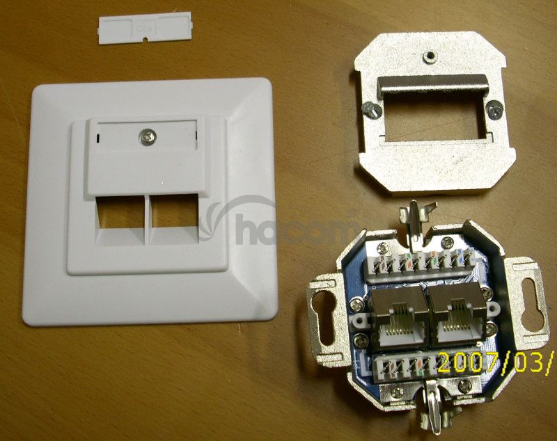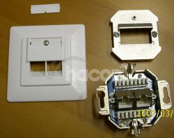 Zásuvka má kovový vnútro, nie je Samorezná, LSA KroneSTP dvojzásuvka Cat.5e pod omietku 45 st.Cat 5e